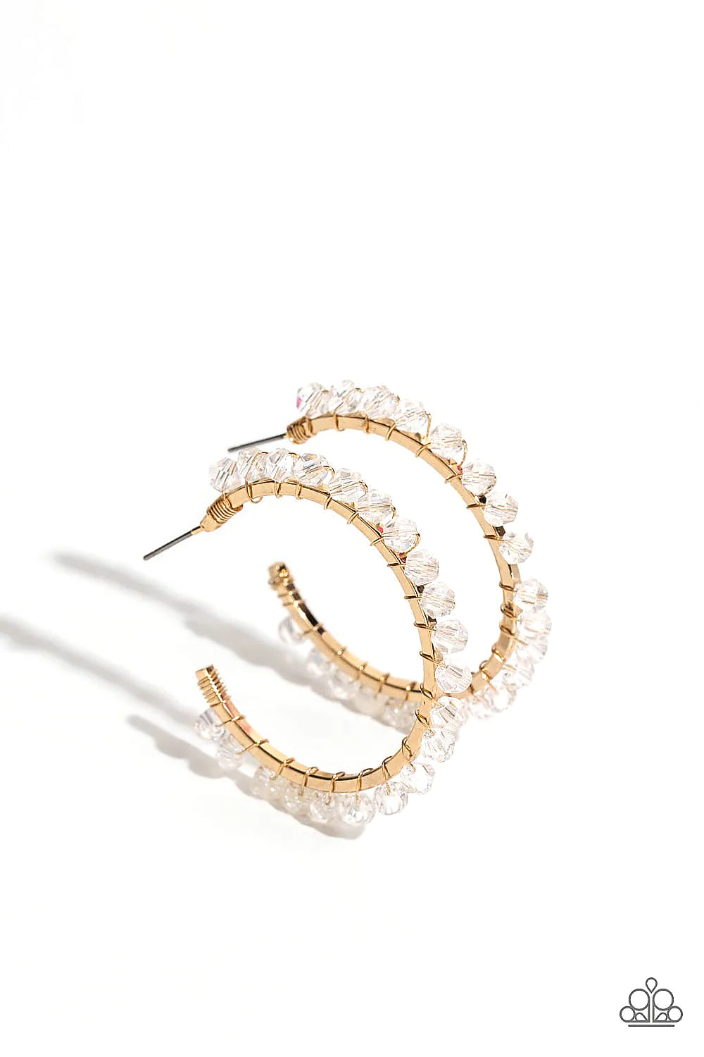 Threaded along a dainty gold wire, an iridescent collection of brown, golden brown, and topaz colored crystal-like beads wrap around the front of a classic gold hoop for an unexpected pop of shimmer. Hoop measures approximately 1 3/4" in diameter.