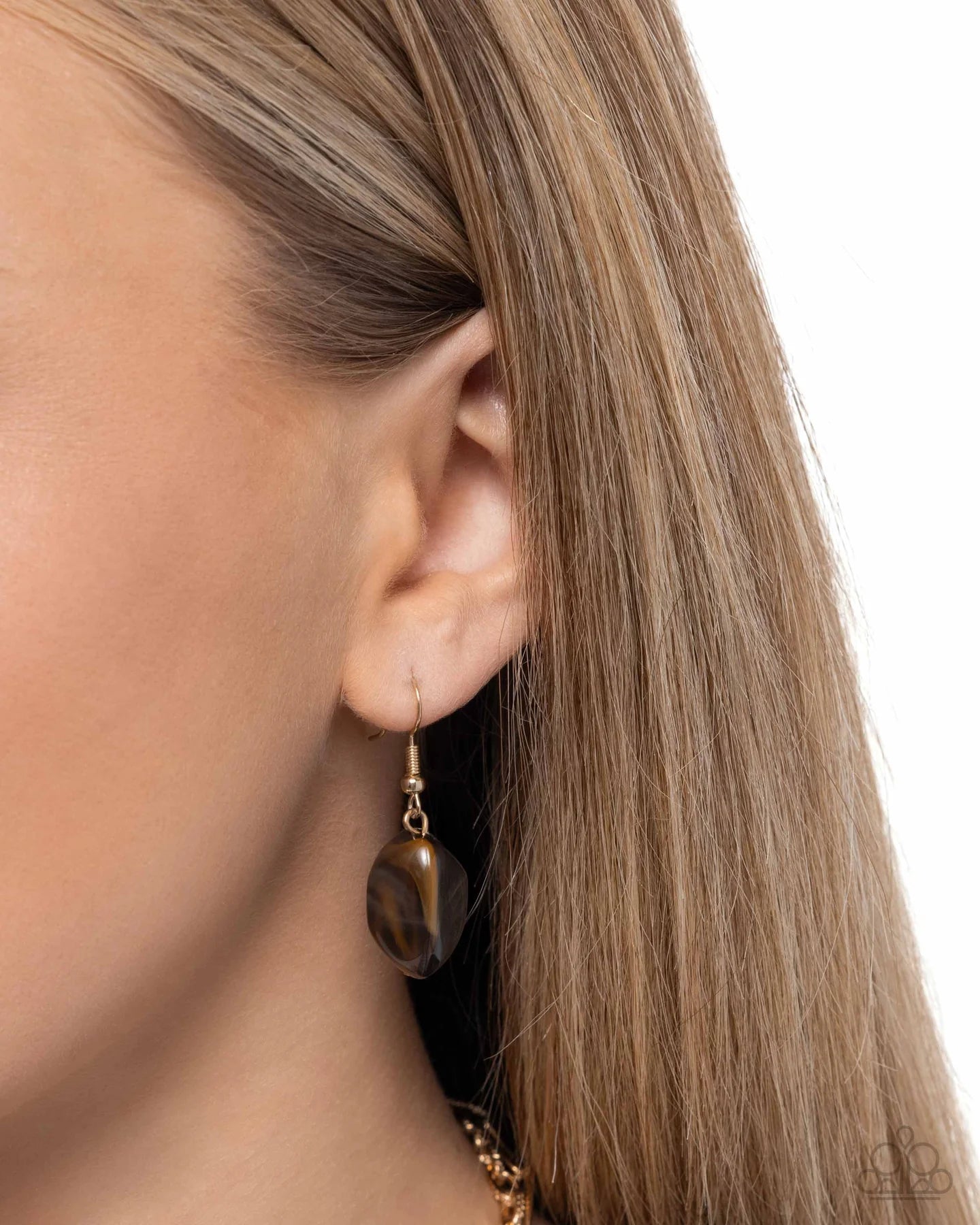A pair of gold chains layers gracefully below the neck, highlighting a collection of oversized topaz and brown acrylic beads. The sleek design blends earthy tones with a touch of modern elegance. Features an adjustable clasp closure.
