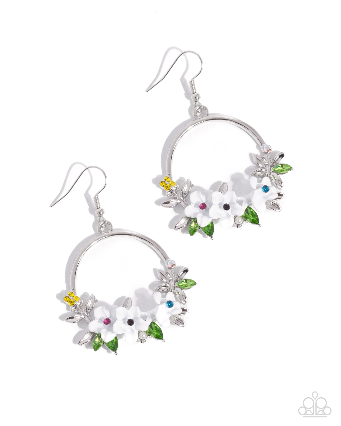 Encrusted along the bottom of a silver hoop, a vivacious collection of painted white flowers with multicolored rhinestone centers bloom next to silver and green marquise-cut gem leaves. White pearls, iridescent rhinestones, and yellow rhinestones coalesce across the surface of the hoop for additional light-catching attention. Earring attaches to a standard fishhook fitting. Due to its prismatic palette, color may vary.