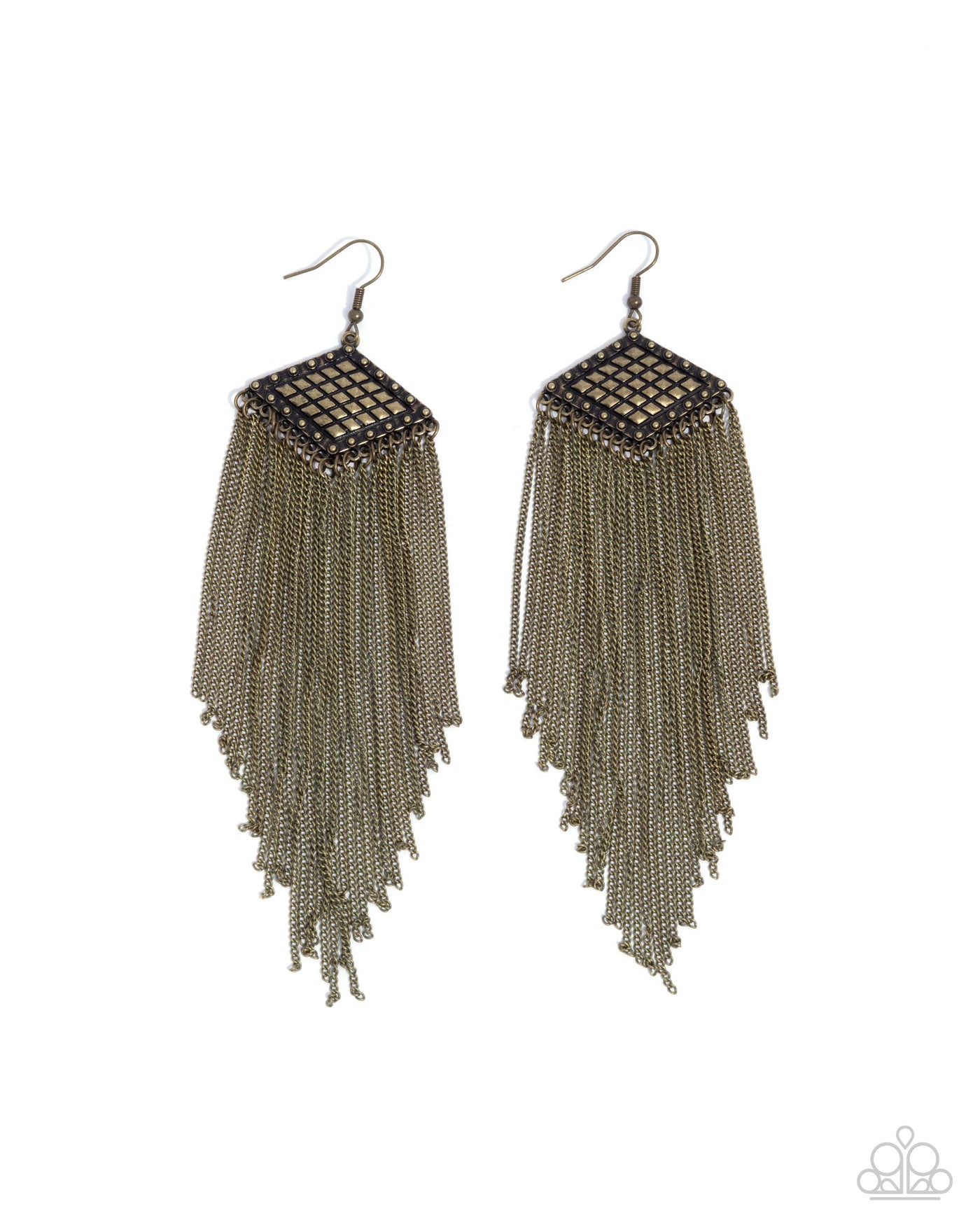 An intricate brass grid-like design is set atop a geometric frame, with cascading layers of brass chains creating a fringe effect that swings with every movement. The combination of the structured grid and flowing chains adds a dynamic contrast, adding a perfect statement to any look. Earring attaches to a standard fishhook fitting.