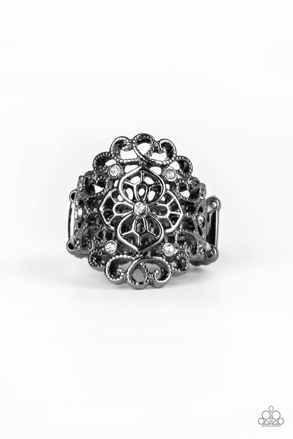 Dainty white rhinestones are sprinkled along a frilly gunmetal frame swirling with airy filigree for a refined flair. Features a stretchy band for a flexible fit.