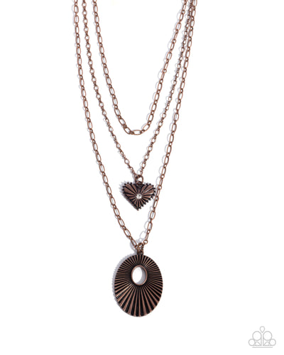 A trio of abstract copper chains layers below the neckline for an energetic eclectic look. Radiating with sunburst textures, a studded copper heart charm with a white rhinestone center and a copper oversized oval pendant glide along the lowermost chains for a timelessly textured display. Feature an adjustable clasp closure.
