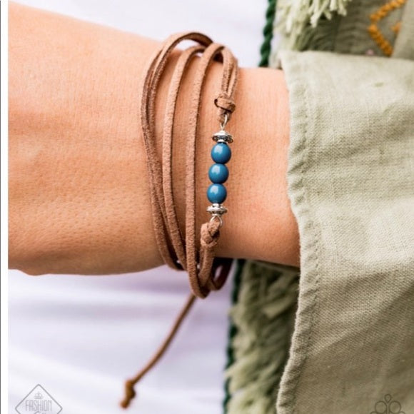 Strands of earthy brown suede layer around the wrist, creating a beautiful neutral backdrop for a row of vibrant blue beads to take center stage. Features an adjustable sliding knot closure.
