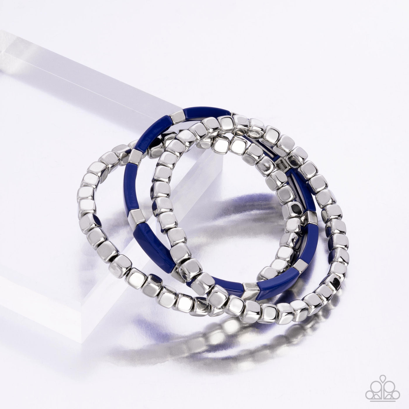 Infused along elastic stretchy bands, a collection of cubed silver beads and Marlin-painted frames shimmer and stack along the wrist for a colorfully chic look.