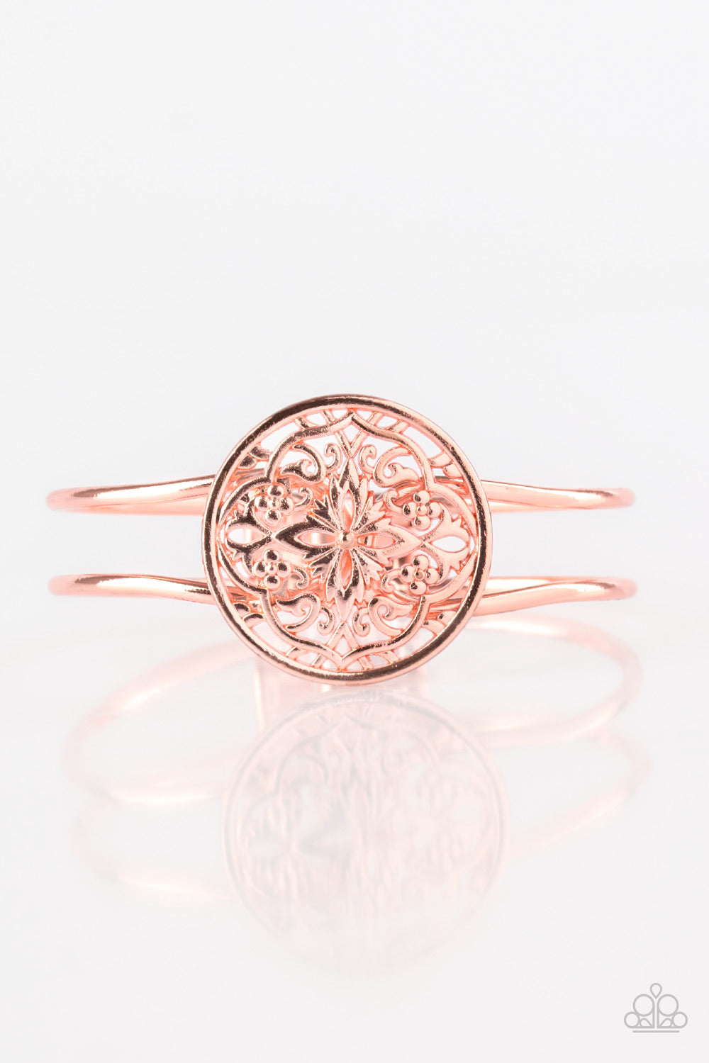 Brushed in a high-sheen finish, shiny copper filigree spins into a mandala like frame atop a dainty cuff for a whimsical look. Features a hinged closure.