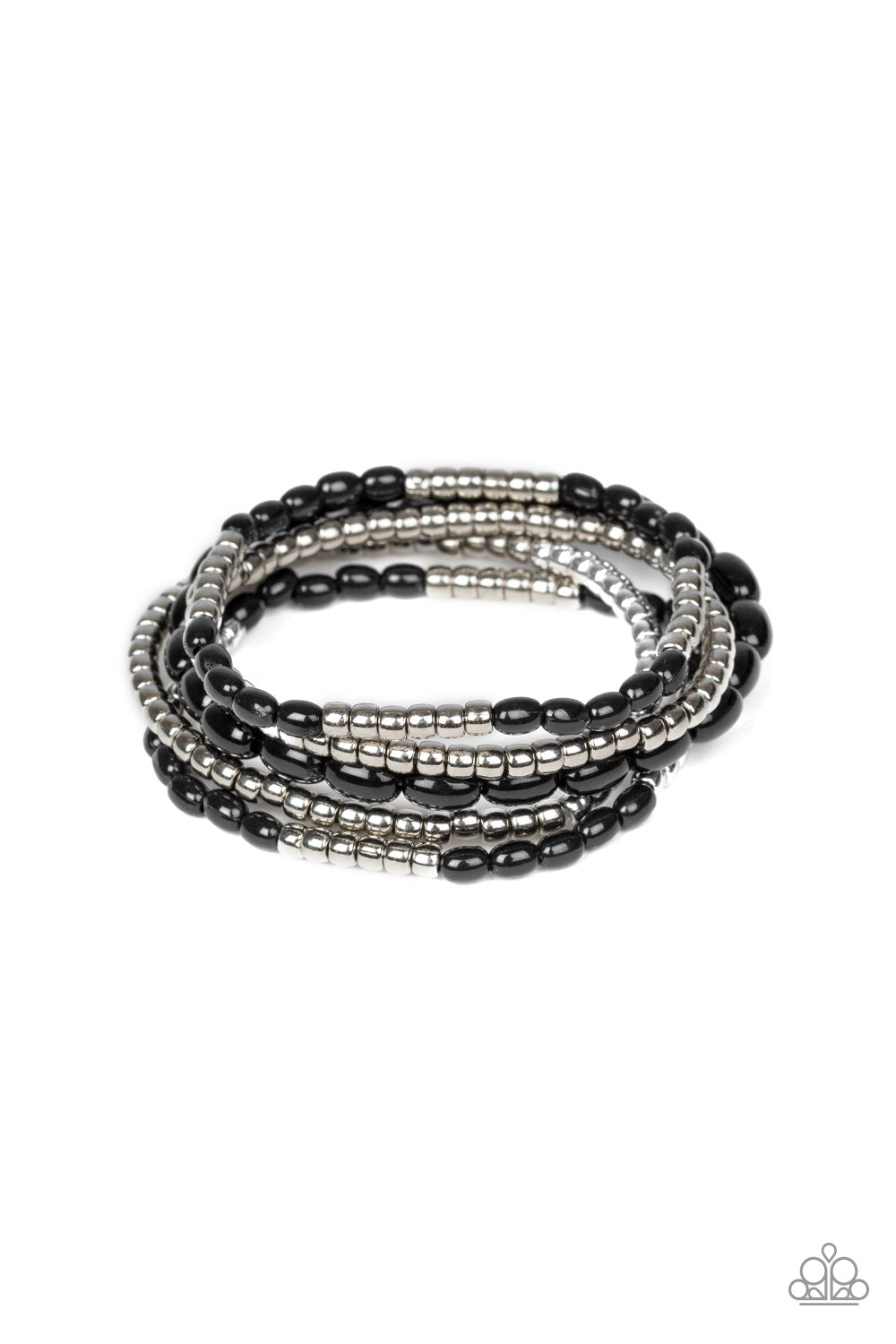 An assortment of black and silver beads are threaded along stretchy bands around the wrist, creating colorful layers.