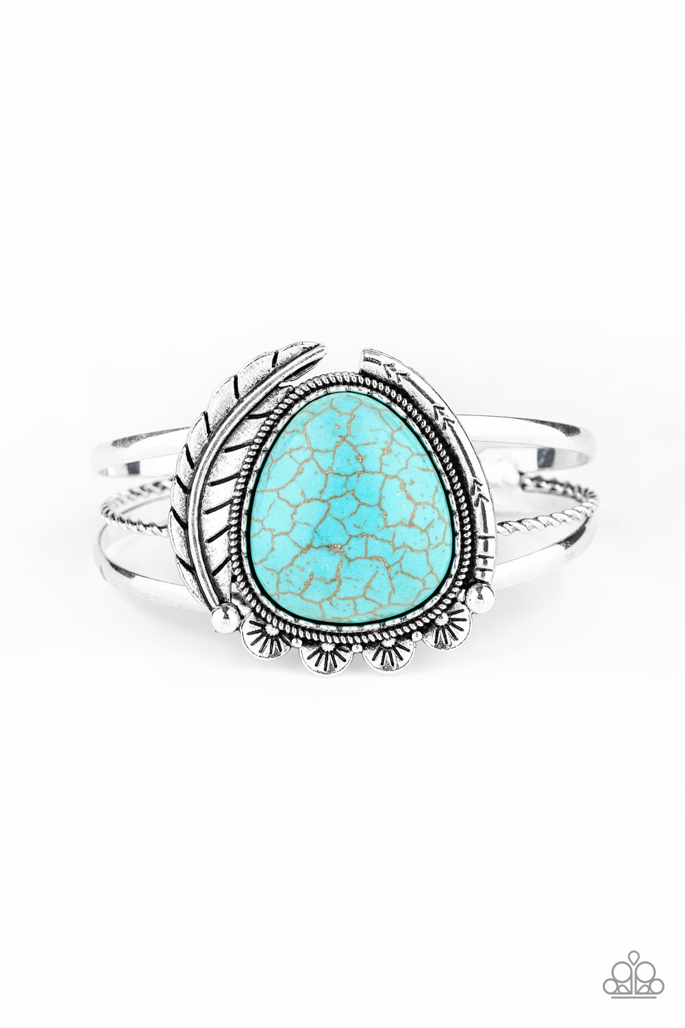 Chiseled into a tranquil teardrop shape, a sunny yellow stone is pressed into the center of a layered silver cuff. Stamped in tribal inspired patterns, mismatched silver frames and an antiqued silver feather wraps around the stone center for a seasonal flair.
