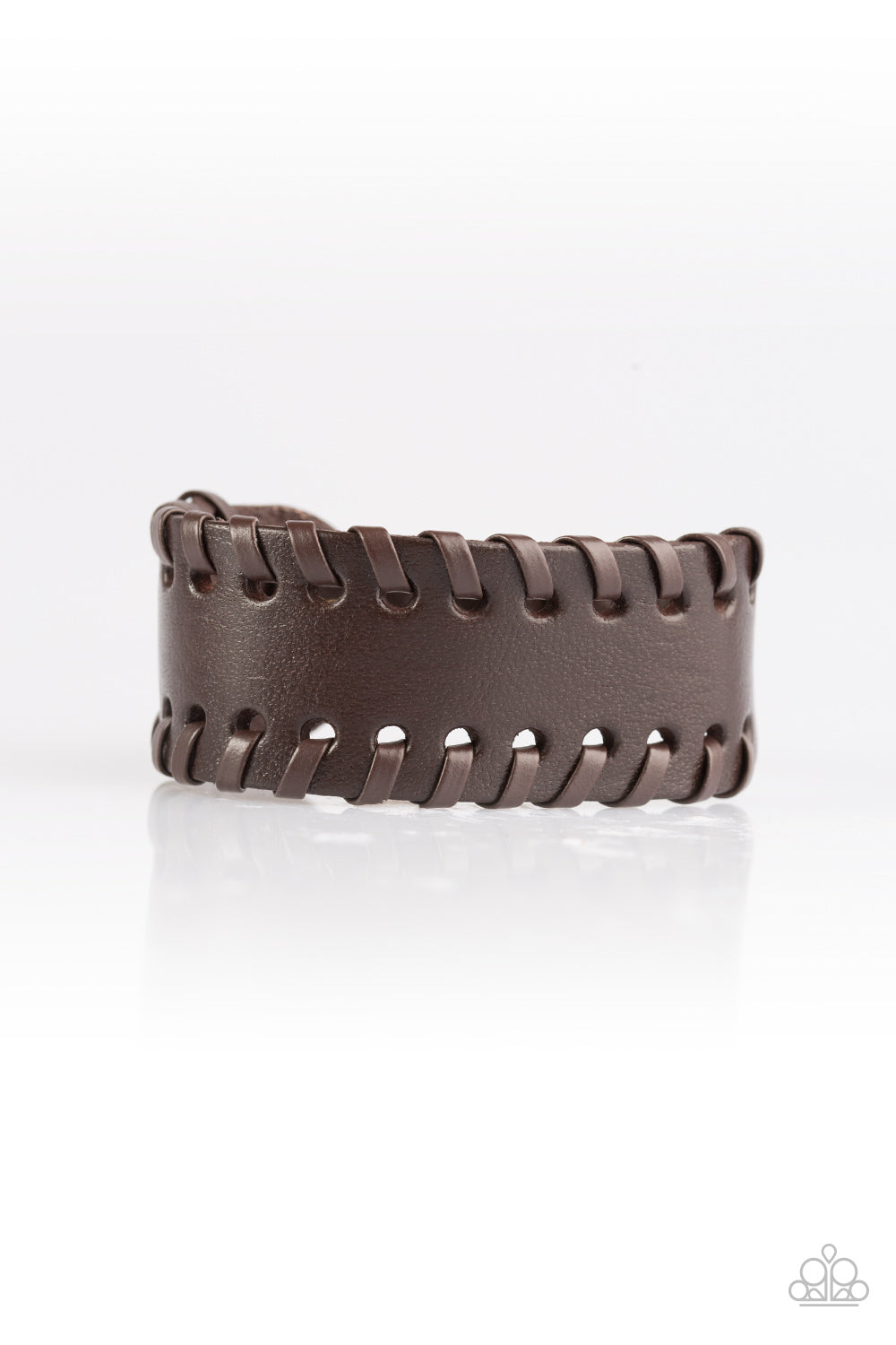 Brown leather laces are stitched along the edges of a thick leather band, creating a rustic look around the wrist. Features an adjustable buckle closure.