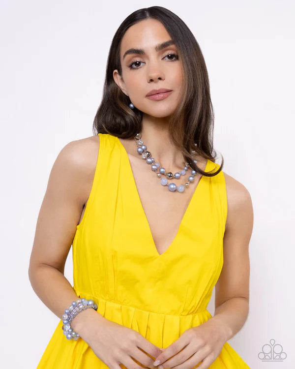 Chambray blue milky, clear, and glittery beads in varying sizes and faceted details combine with sleek silver beads along elastic stretchy bands for a colorful stack.