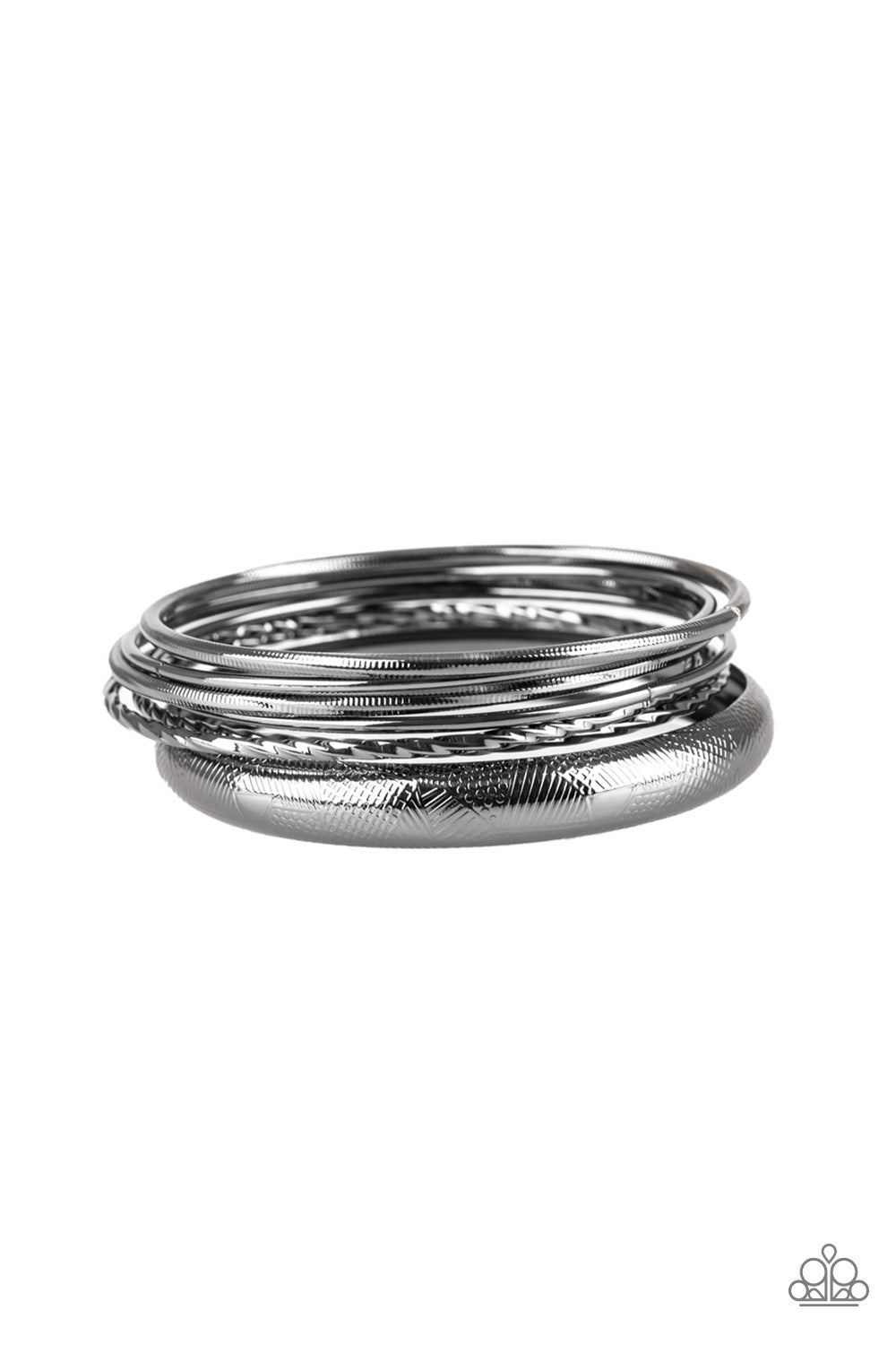 Featuring smooth and textured finishes, a collection of mismatched gunmetal bangles stack across the wrist for a classic look.