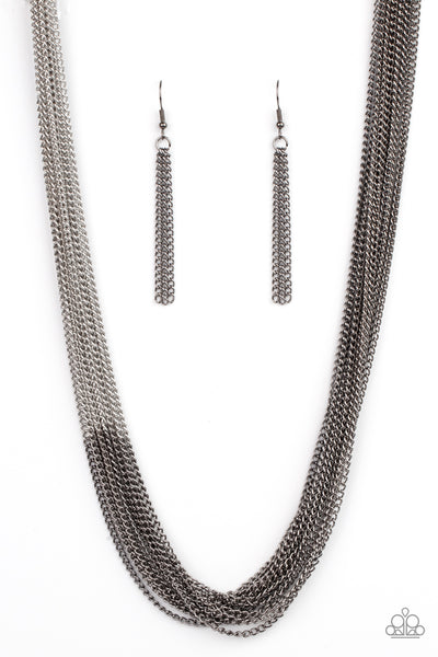 Sections of glistening gunmetal chains collide with shimmery silver chains below the collar, linking into dramatic layers for an edgy effect. Features an adjustable clasp closure.