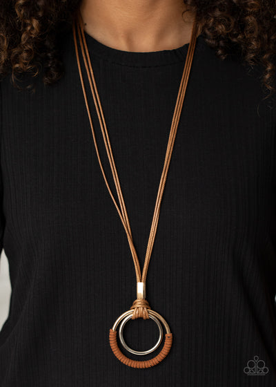 Shiny green cording knots around a pair of silver and gold hoops, creating a stacked pendant. Green suede wraps around the bottom of the gold hoop, adding an earthy flair to the seasonal display. Features an adjustable clasp closure.
