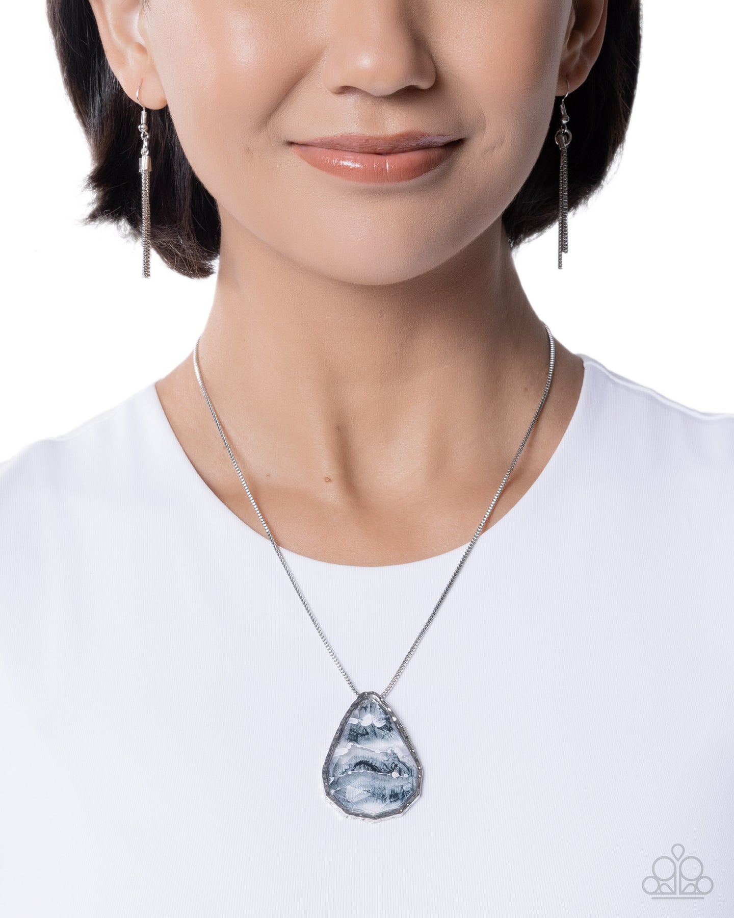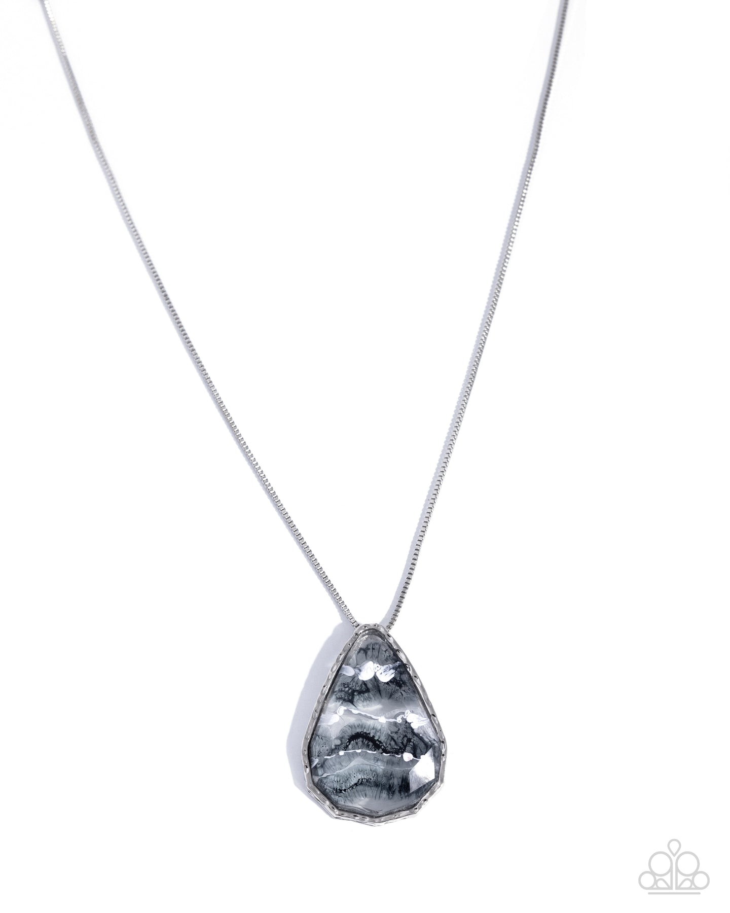 Featuring a black, gray, and white swirl-painted gradient, a hammered silver teardrop pendant with a faceted clear overlay along its top slides along a dainty, silver box chain for an abstract, artistic display. Features an adjustable clasp closure.