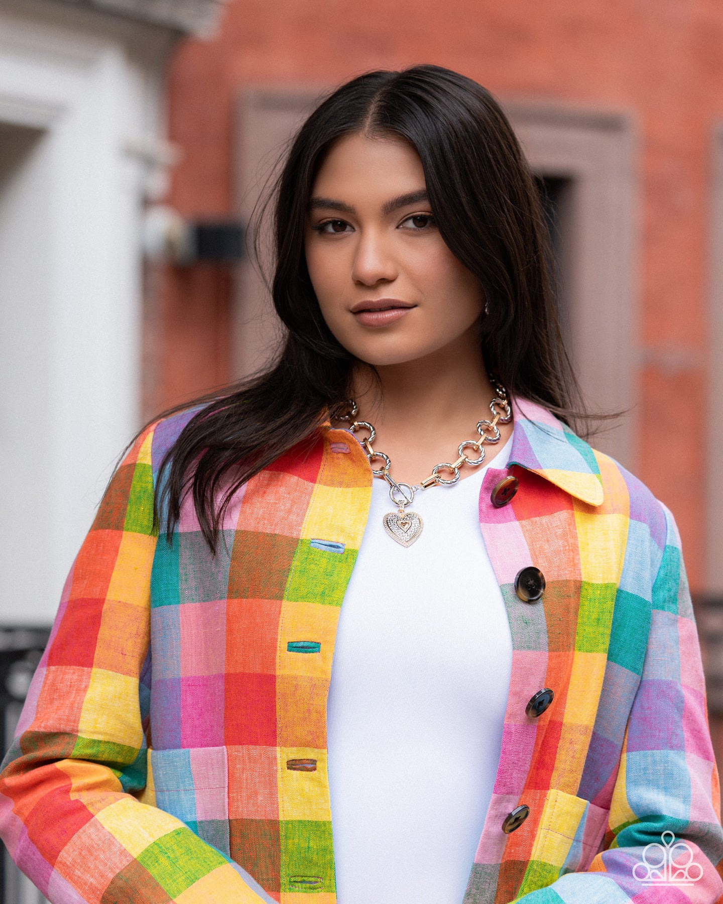 Featuring a sleek finish, twisted silver rings alternate with gold paperclip chain links around the neckline, looping through a silver toggle clasp for a mismatched display. Dusted in white rhinestones, a crimped, layered gold heart pendant sways from a white rhinestone-embellished bail clasp from the silver toggle for a heartfelt finish. Features an adjustable clasp closure.
