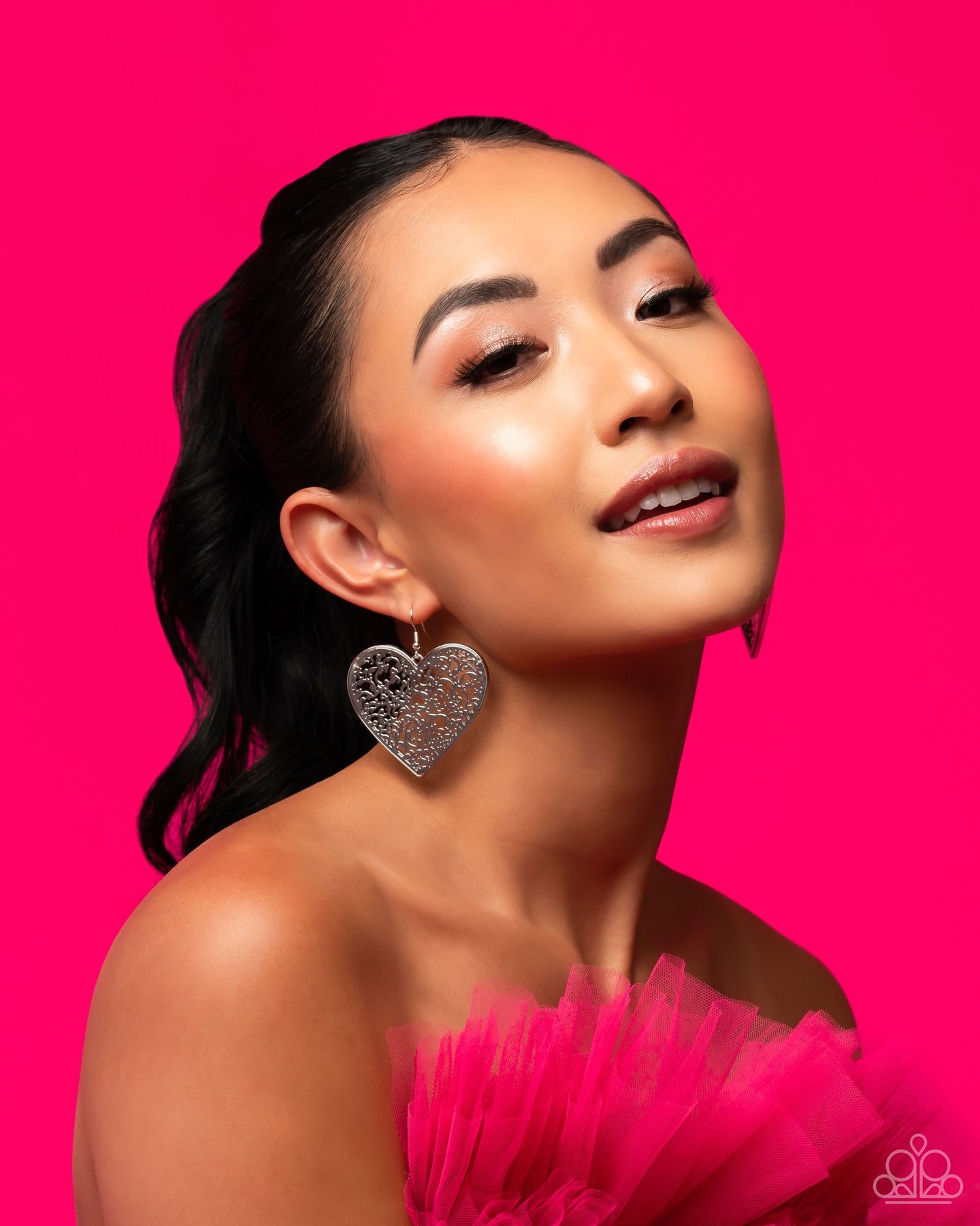 A shiny, oversized shiny copper heart is filled with swirls of filigree, emitting vintage whimsy as it swings from the ear. Earring attaches to a standard fishhook fitting.