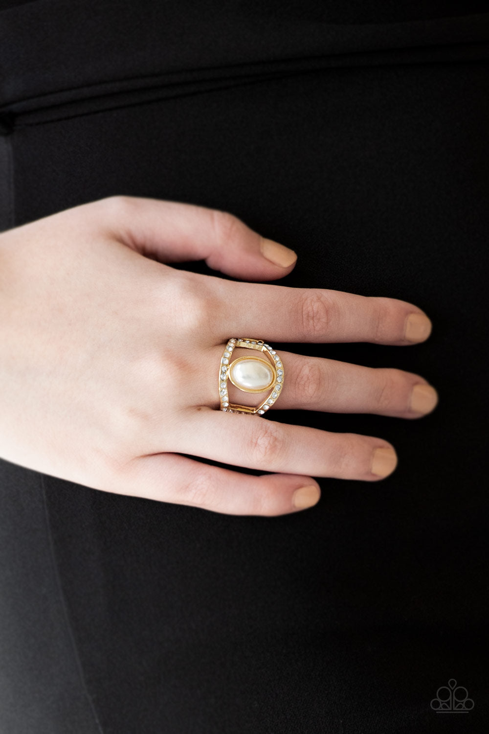 A pearly white bead sits between two white rhinestone encrusted bands, creating the illusion of a floating centerpiece. Features a stretchy band for a flexible fit.
