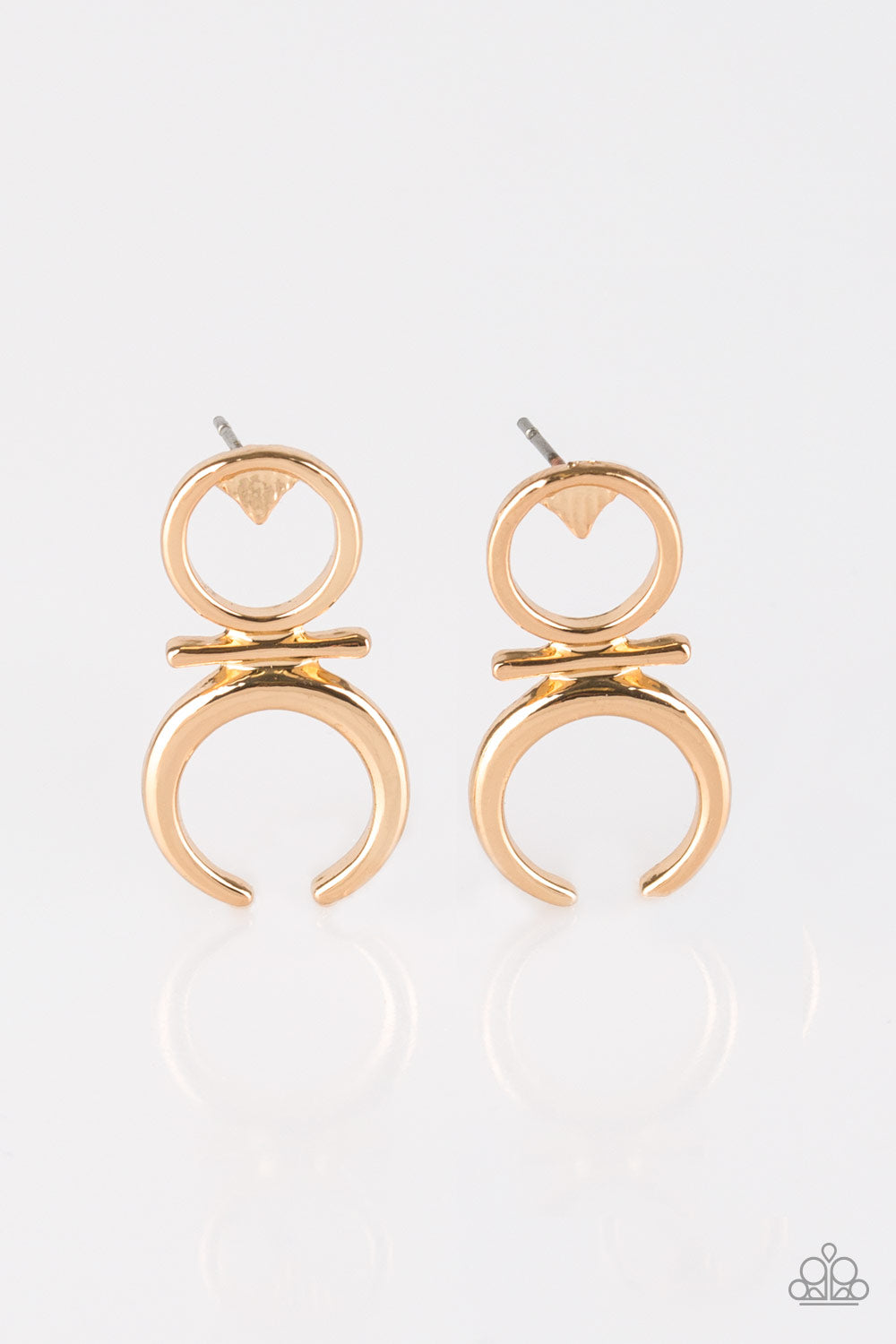 Featuring round and crescent shapes, glistening gold frames connect into an edgy geometrical frame. Earring attaches to a standard post fitting.