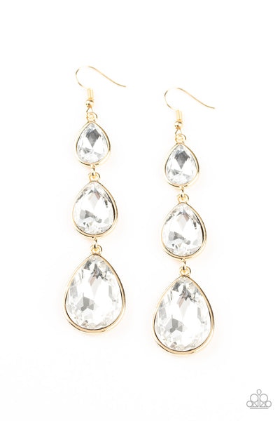 Featuring sleek gold frames, exaggerated white teardrop rhinestones gradually increase in size as they drip from the ear. Earring attaches to a standard fishhook fitting.