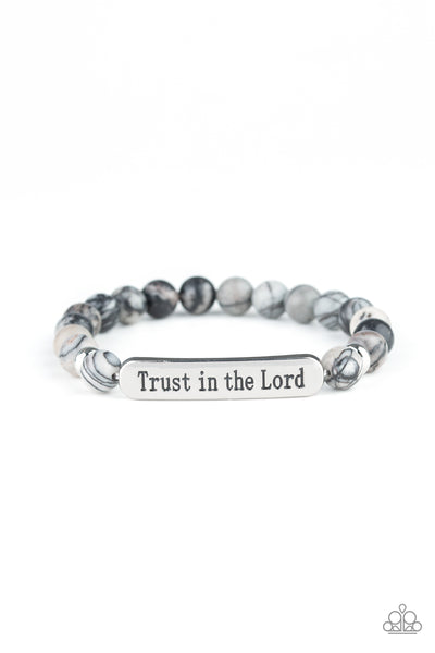 Infused with dainty silver accents, a collection of glassy brown stone beads and a shimmery silver frame stamped in the phrase, "Trust in the Lord", are threaded along a stretchy band around the wrist for an inspirational look.