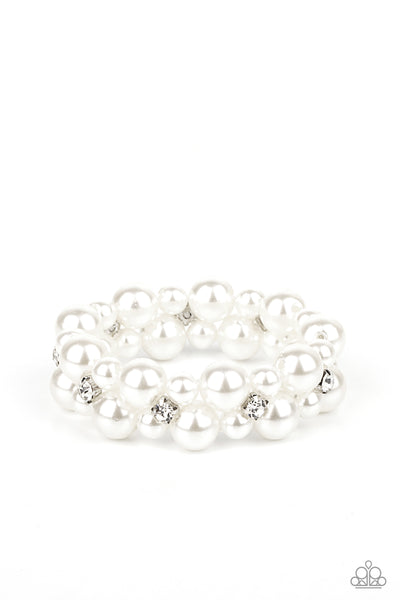 A bubbly collection of white pearls and classic white rhinestones are threaded along stretchy bands around the wrist, creating flirtatious refinement.
