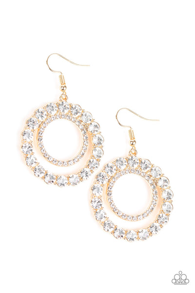 Encrusted in glassy white rhinestones, a dainty gold ring attaches to the top of a larger hoop radiating with blinding white rhinestones for a glamorous, statement-making look. Earring attaches to a standard fishhook fitting.