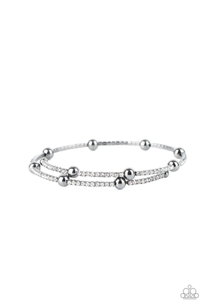 Dainty sections of glassy white rhinestones and glistening gunmetal beads delicately coil around the wrist, creating a timeless shimmer.