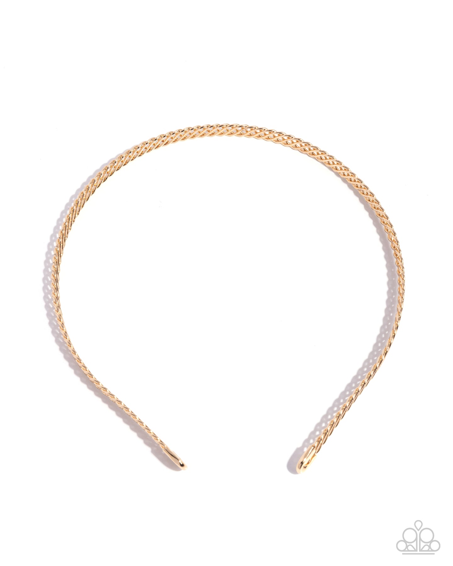 Delicately wrapped around a gold band, a glistening, braided gold ribbon curls atop the head, evoking a polished, preppy look.