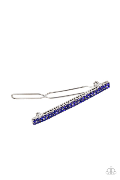 Two rows of glittery blue rhinestones are encrusted across the front of a silver frame, creating a glamorous display. Features a clamp barrette closure.