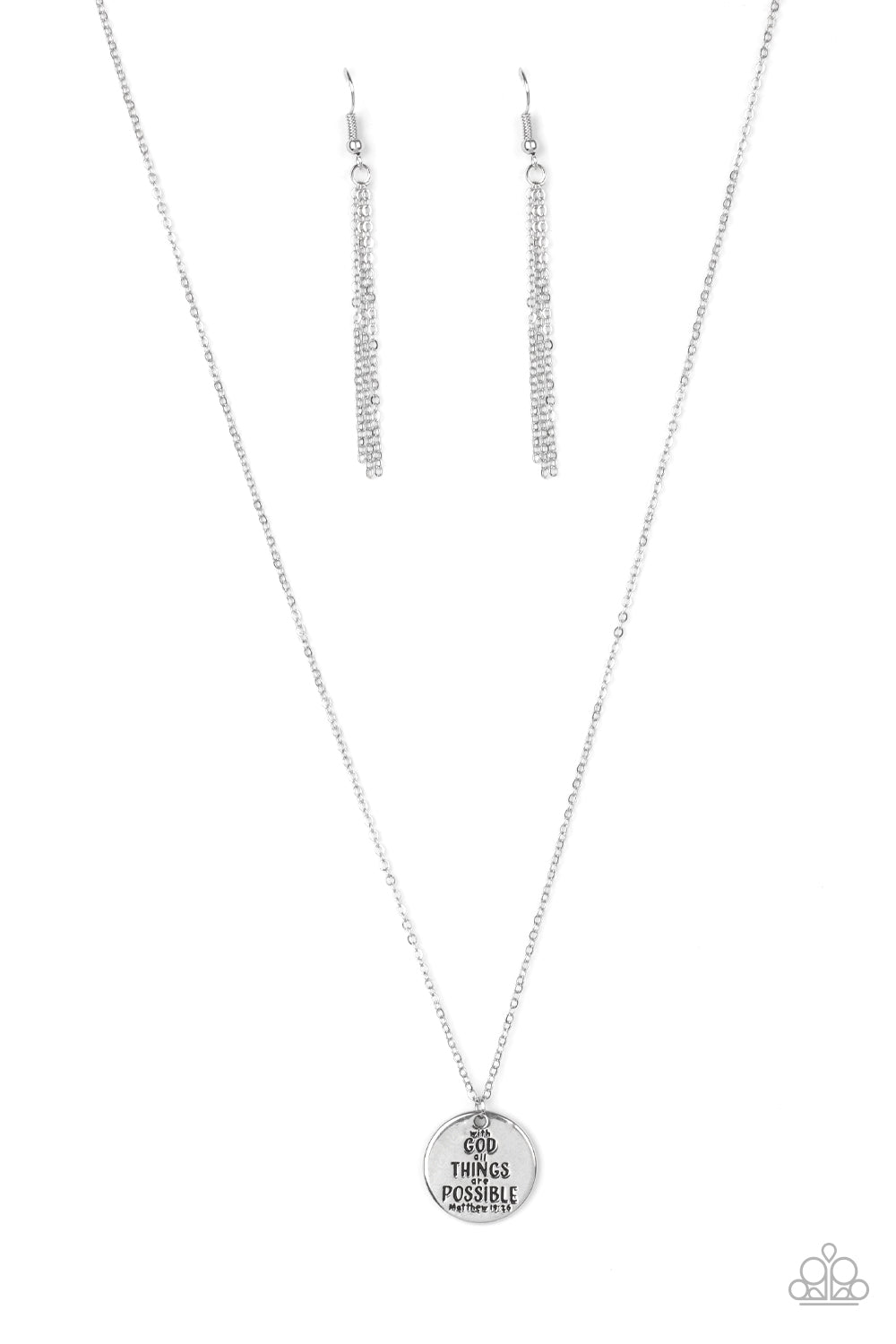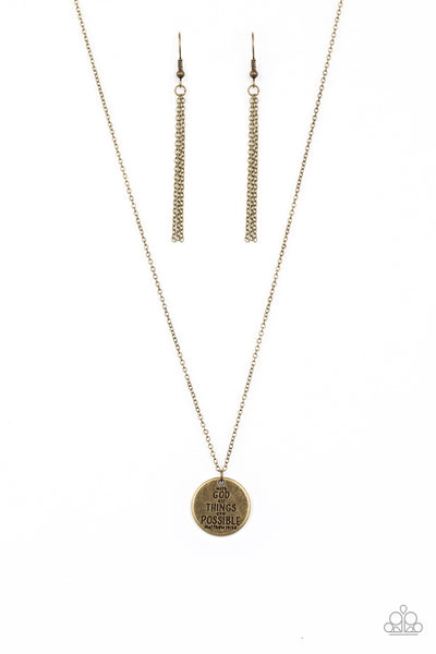 Brushed in an antiqued finish, a dainty brass pendant is stamped in the inspirational phrase, "With God All Things Are Possible, Matthew 19:26". Features an adjustable clasp closure.