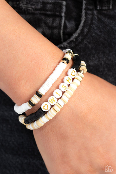 Varying in shades, tan, black, and white clay discs pair with shiny gold disc beads and accents creating layers across the wrist. Featured on one of the bracelets, white beads stamped with gold lettering spell out the word "wish," while gold heart silhouettes stamped in the same white beads frame the inspirational phrase for a wistful finish.