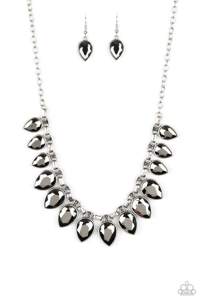 Dotted with dainty hematite rhinestones, a fierce fringe of over sized hematite teardrop frames fan out below the collar for a fearless fashion. Features an adjustable clasp closure.