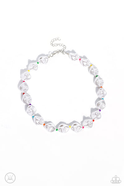 Rippling in texture, baroque white pearls alternate with Pink Peacock, Empire Yellow, green, orange, blue, purple, and red seed beads around the collar for a beachy statement. Features an adjustable clasp closure.