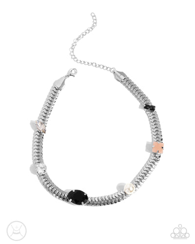 Pronged along a thick, abstract silver chain, a collection of multicolored, smoky, and opaque gems in emerald-cut, round, oval, square, and marquise-cut shapes join a solitaire glossy white pearl around the collar for a classy collection of shimmer and shine. Features an adjustable clasp closure.