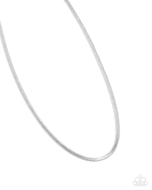 Featuring a high sheen, a simple silver snake chain cascades below the neckline for a subtly assertive statement. Features an adjustable clasp closure.