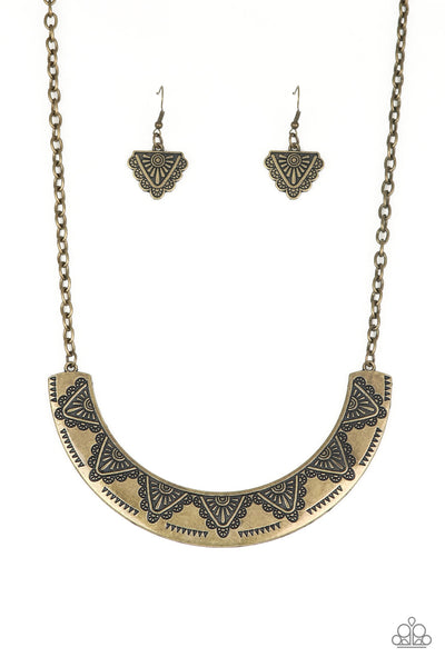 Stamped in decorative geometric patterns, an antiqued crescent plate swings below the collar for a tribal inspired look. Features an adjustable clasp closure. Paparazzi Accessories