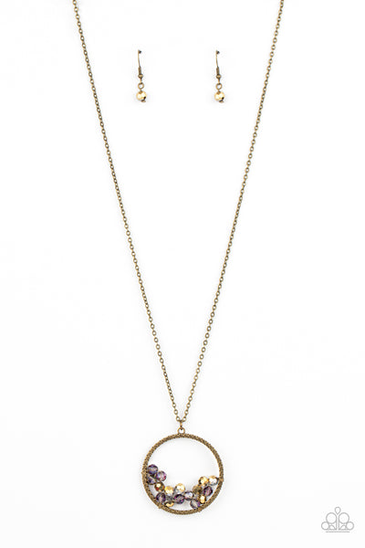 A cluster of metallic flecked aurum and iridescent crystal-like beads are threaded along dainty brass wire along the bottom of a textured brass hoop, creating a stellar pendant at the bottom of a lengthened brass chain. Features an adjustable clasp closure.