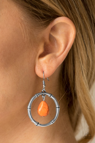 Chiseled into a tranquil teardrop, an earthy orange stone swings from the top of a textured silver hoop, creating a handcrafted, artisan inspired lure. Earring attaches to a standard fishhook fitting.