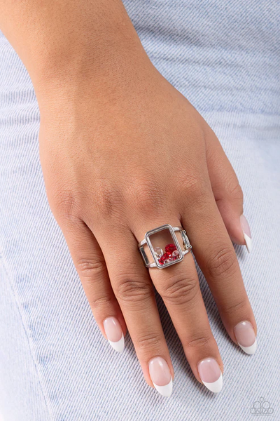 A collection of white, black, and smoky gems and rhinestones are encased inside a glassy, emerald-cut casing, creating an edgy, standout centerpiece atop airy silver bands. Features a stretchy band for a flexible fit.