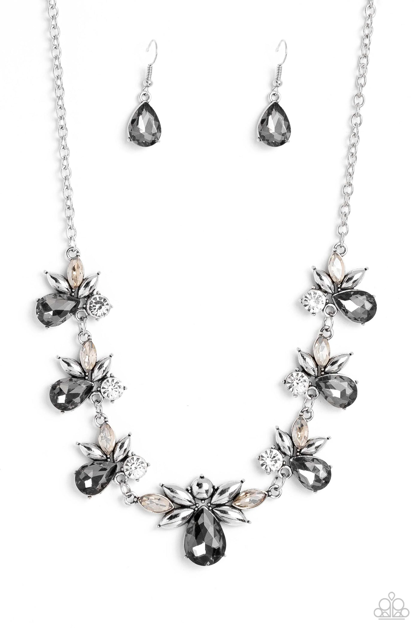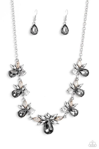Vibrant red teardrops with explosions of white gems, and silver and white marquise-cut gems fanning around it, elegantly trickle into refined clusters along a shimmery silver chain, creating a timeless geometric palette. Features an adjustable clasp closure.