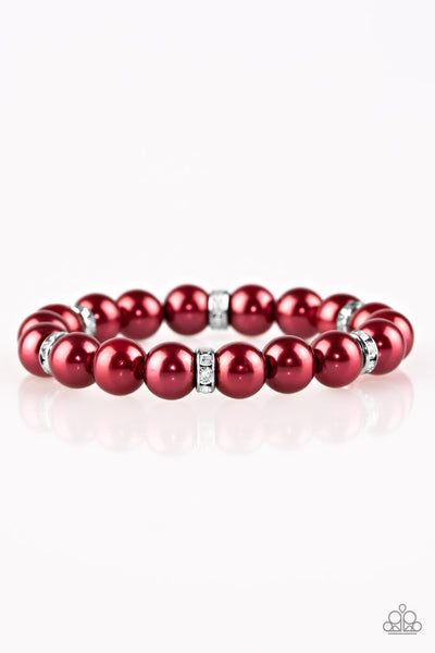Classic red pearls and glittery white rhinestone encrusted rings are threaded along a stretchy band, creating a timeless centerpiece around the wrist.