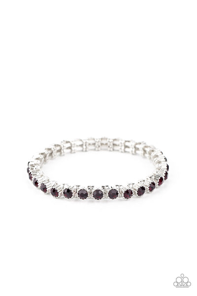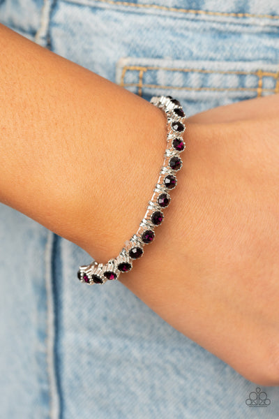 Featuring shiny silver studded fittings, glittery purple rhinestones glide along stretchy bands around the wrist, creating a glamorous statement piece.