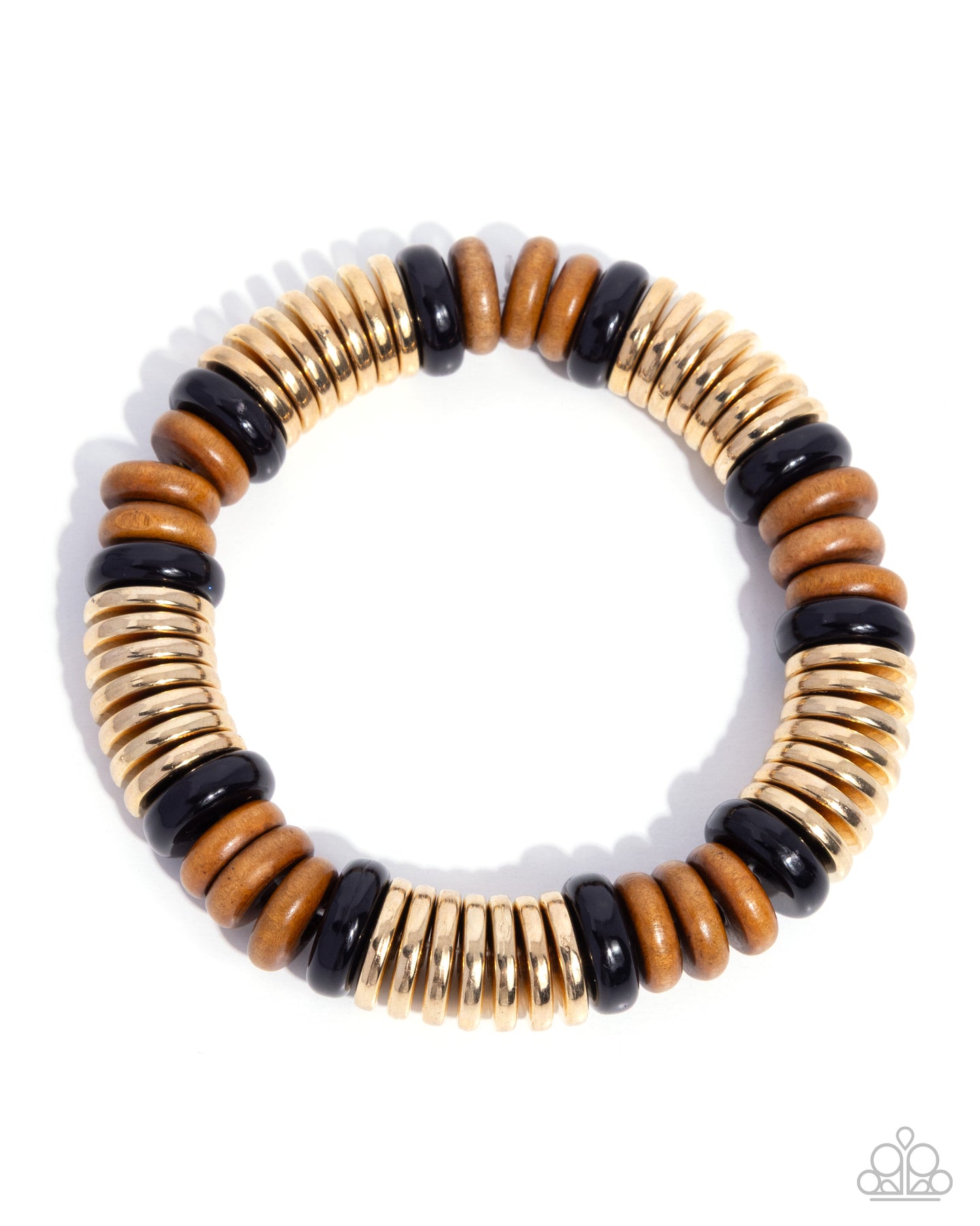 Infused along an elastic stretchy band, a collection of glistening gold discs sporadically interrupts brown wood discs and polished Chili Oil discs atop the wrist for a radically rustic display.