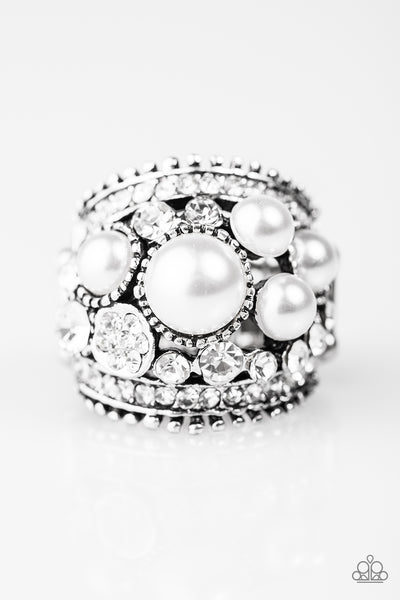 Iridescent pearls and radiant rhinestones are sprinkled haphazardly across a chunky silver band, creating a glitzy statement piece. Features a stretchy band for a flexible fit.