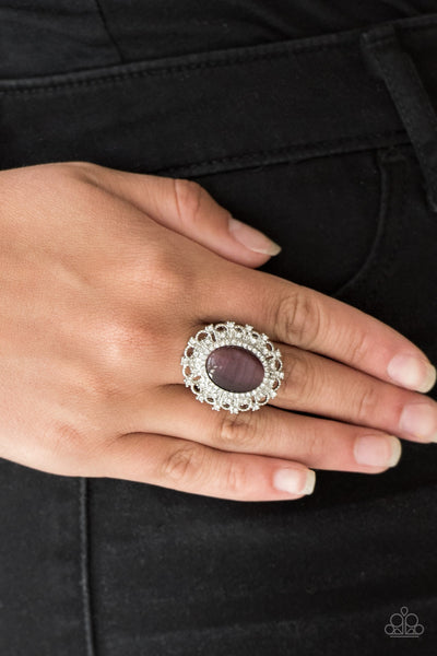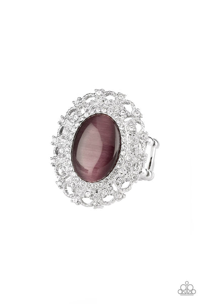 Encrusted in dainty white rhinestones, a frilly silver frame spins around a glowing moonstone center for a regal look. Features a stretchy band for a flexible fit.