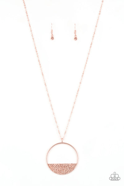 Encrusted in dainty peach rhinestones, a shiny copper crescent frame is pressed into the bottom of an airy circular pendant for a timeless look. Features an adjustable clasp closure.