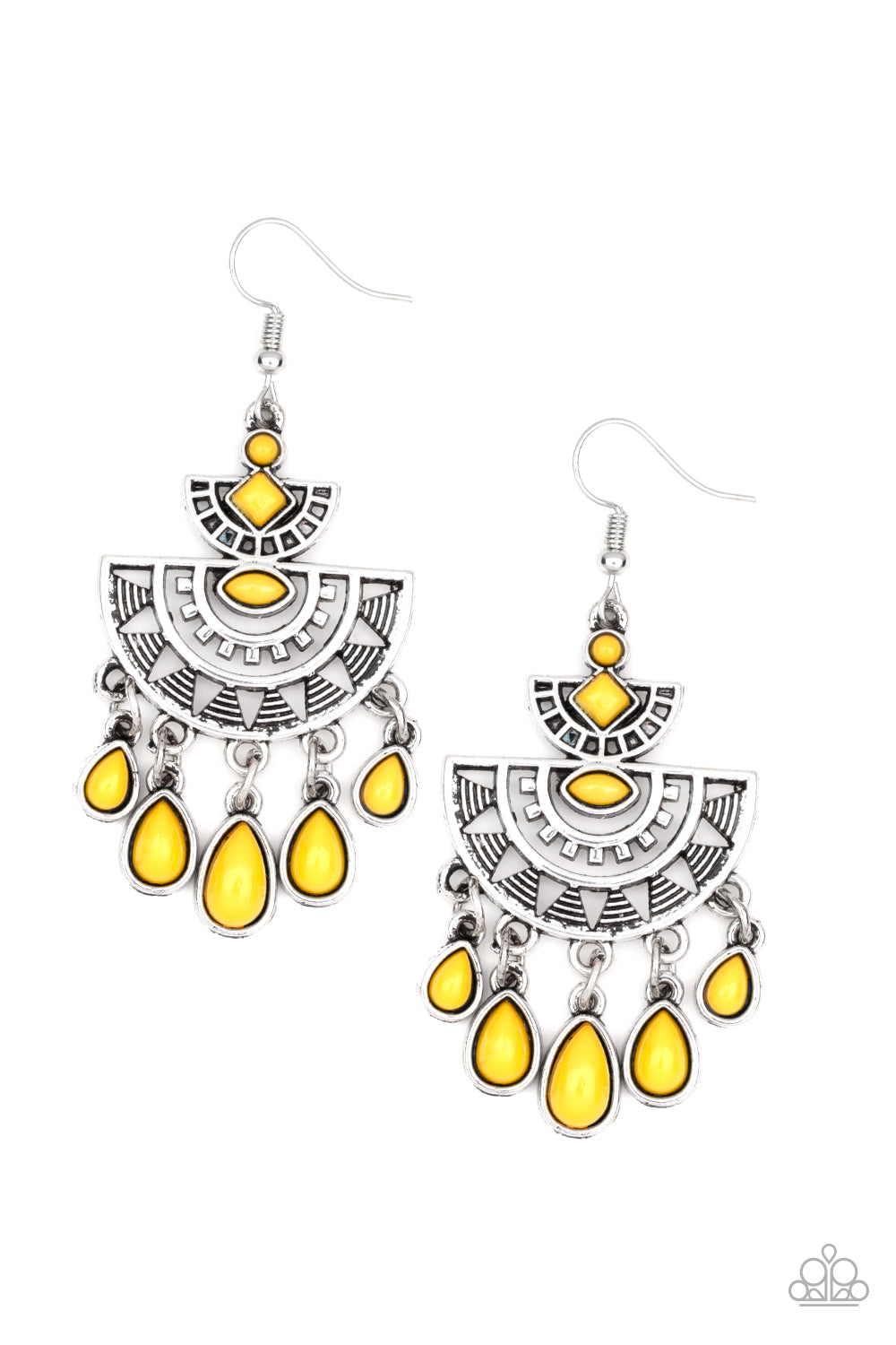 Radiating with sunburst patterns, a yellow beaded silver frame gives way to a matching yellow teardrop fringe for a seasonal flair. Earring attaches to a standard fishhook fitting.