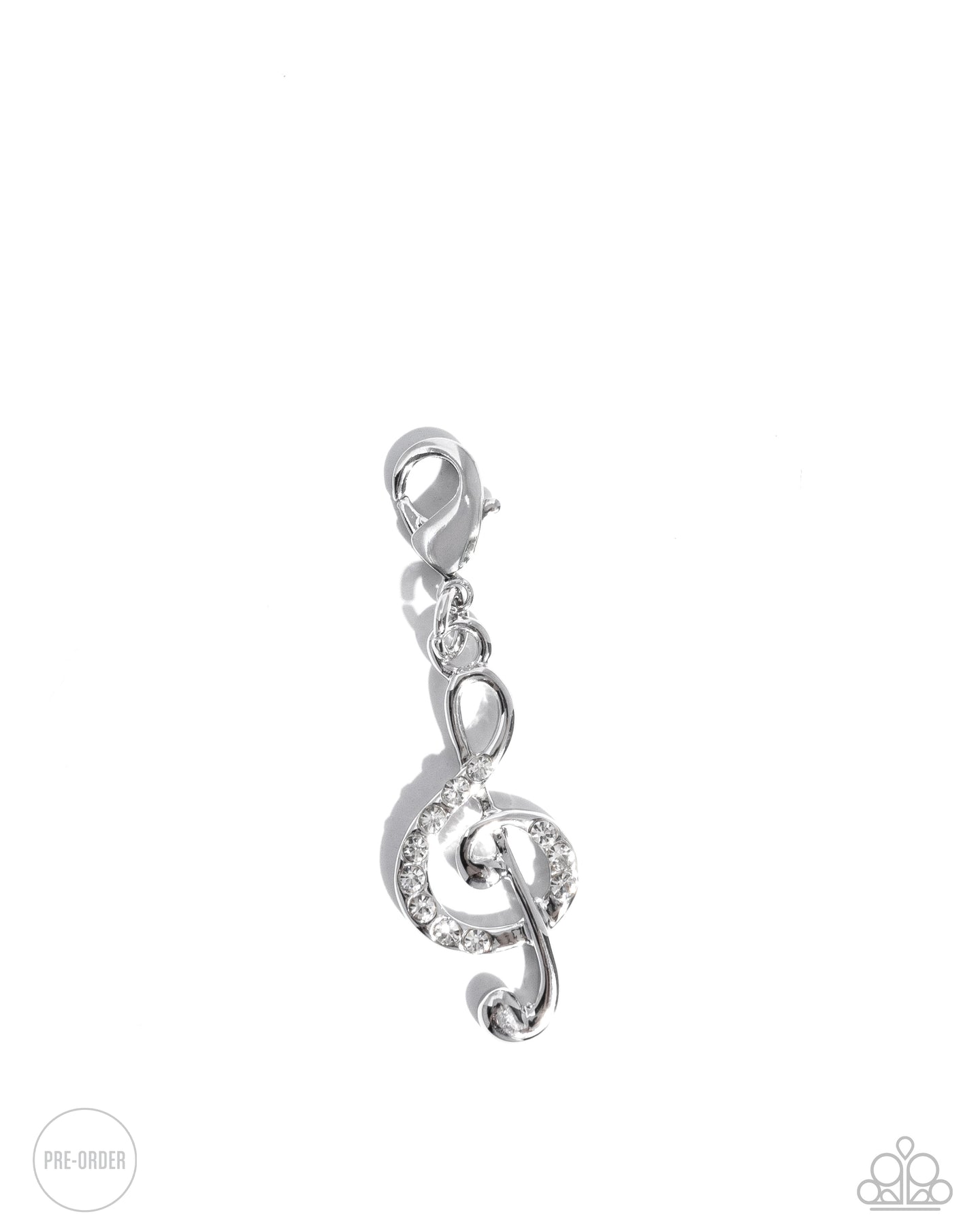 Dusted in white rhinestones, a glistening rhodium plated treble clef pendant reflects light in every direction. Features a clasp closure. Can be attached to a variety of chains for a musically monochromatic look. Charm measures approximately 1" in length.