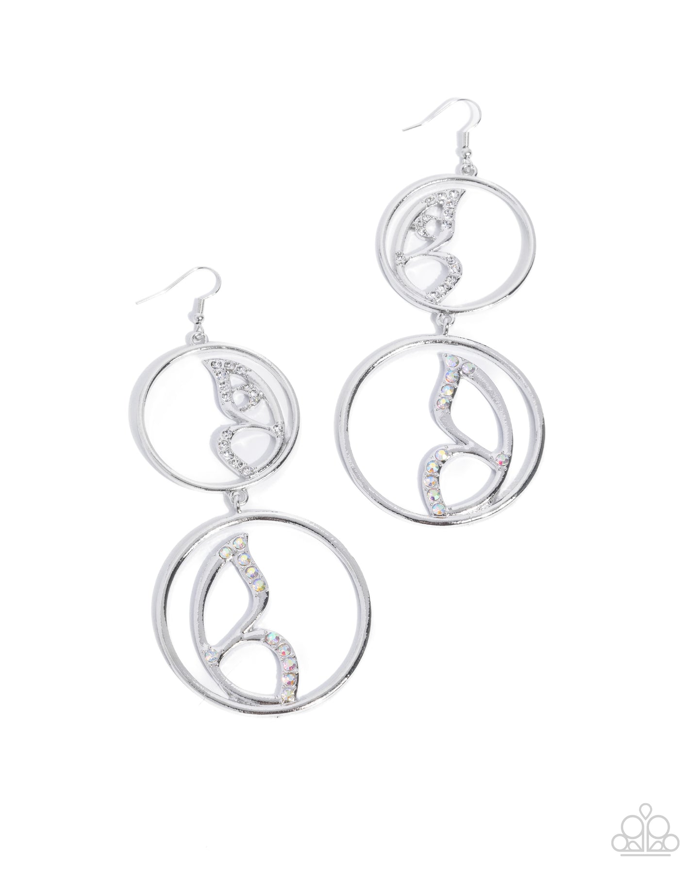 Fluttering along the inside of airy silver rings, a duo of silver butterfly wings alternating in direction between the two rings is embellished in white and iridescent rhinestones for a fairy-inspired display. Earring attaches to a standard fishhook fitting. Due to its prismatic palette, color may vary.
