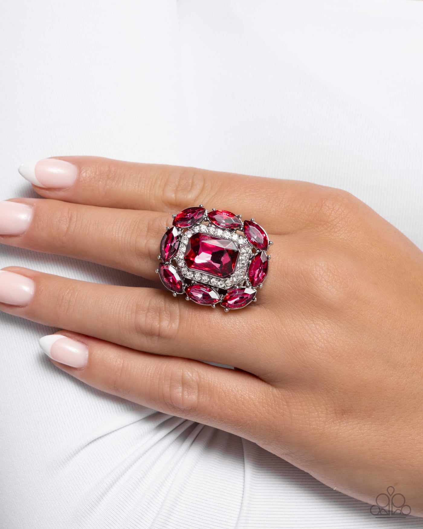 A faceted emerald-cut peach gem is pressed into an elaborate copper frame filled with blinding marquise-cut gems in alternating shades of light-colored topaz and peach for a dynamically colorful statement atop the finger. An additional border of shimmer with dainty white rhinestones encircles the emerald-cut centermost gem for a light-reflective finish. Features a stretchy band for a flexible fit.