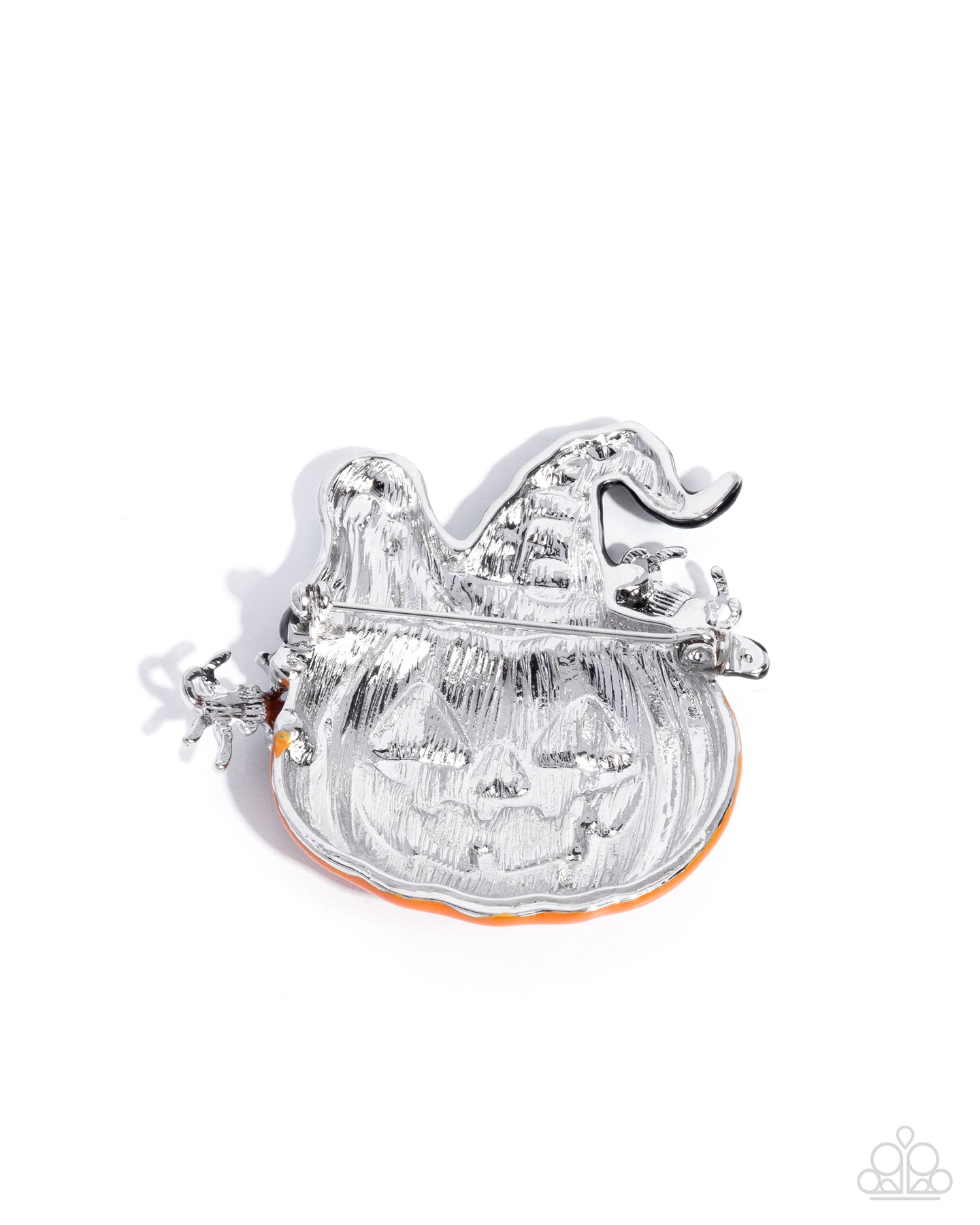 Featuring a duo of glistening silver spiders, an oversized orange jack-o'-lantern with black-painted details, and a black-painted witch's hat stands out beside a white ghost with black-painted detailing for a Halloween-inspired haute look. Brooch measures approximately 2" in length and 2" in width.